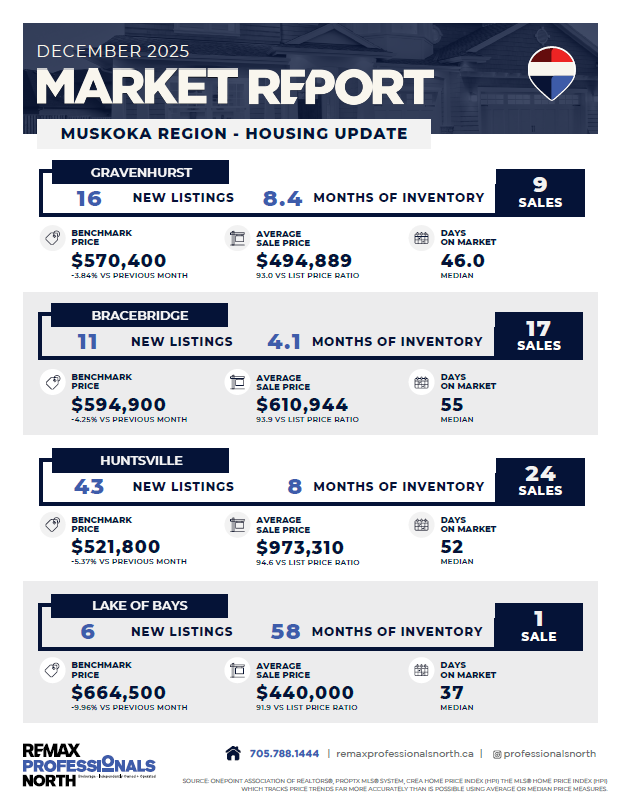 Stay informed with our comprehensive Market Report, offering a snapshot of last month’s activity in the local market. We highlight key trends, including sales, pricing, and days on market for Gravenhurst, Bracebridge, Huntsville and Lake of Bays.